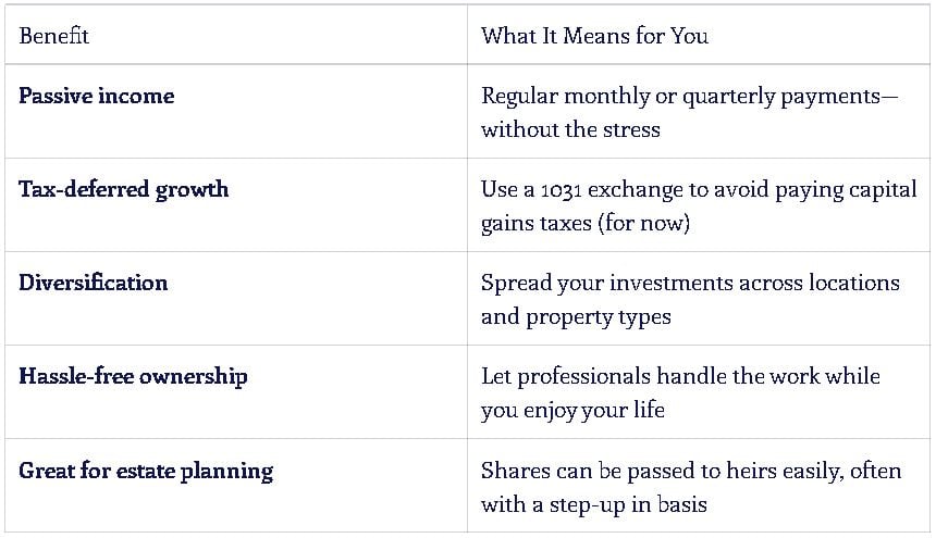 1031 exchange-friendly – DSTs qualify as “like-kind” property, so you can defer capital gains taxes when you sell a property and reinvest.